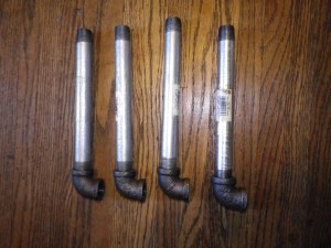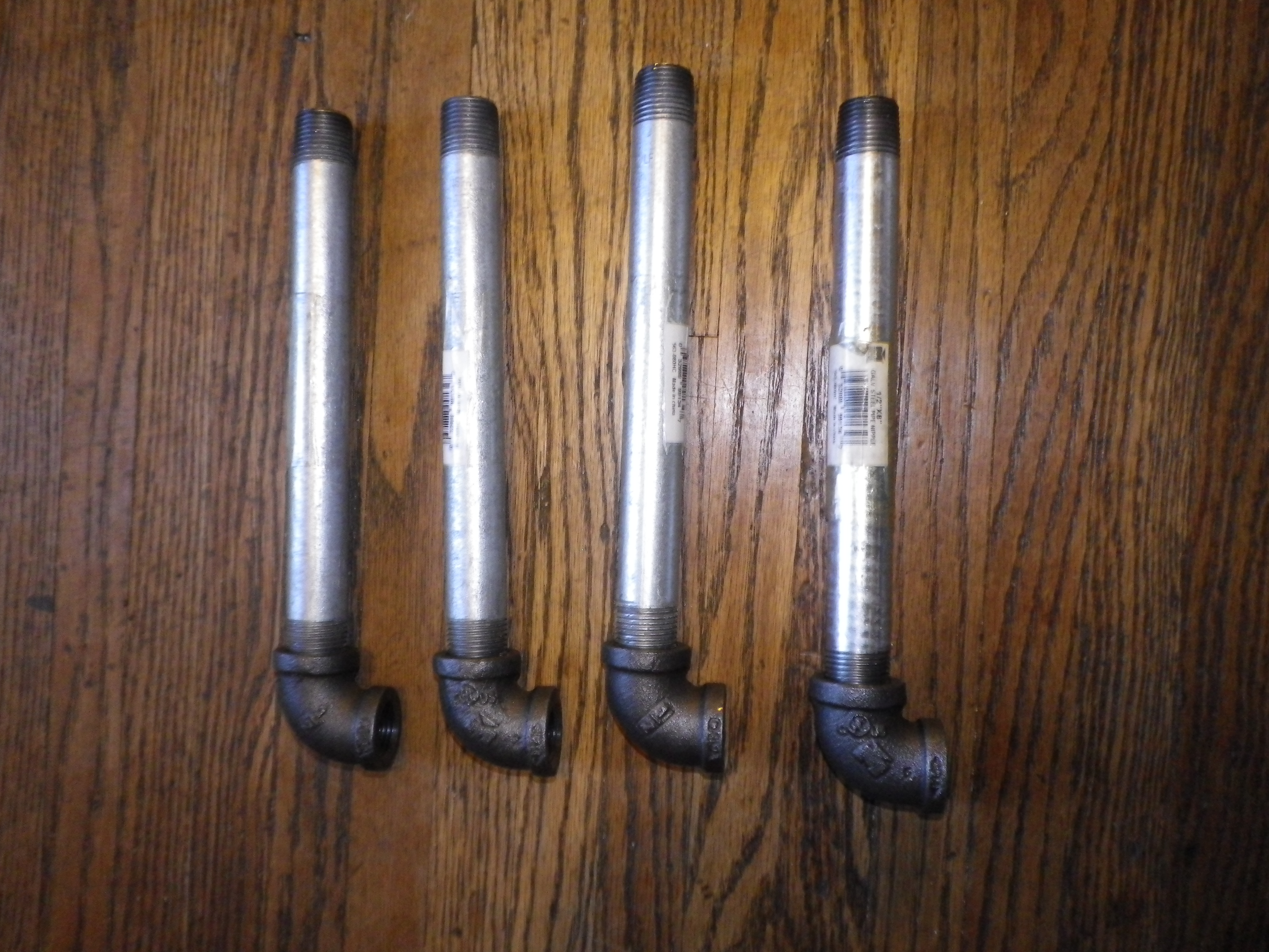 Okay, here goes… take four of the elbows and the four nipples and screw an elbow onto one end of each nipple. Like so…