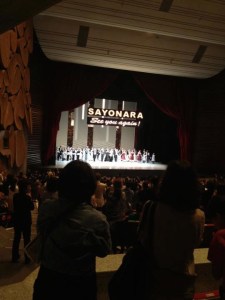 “The Bat” was very well received by the audience, we all had a great time! And when it was over, the applause went on and on. And then there was confetti and a lighted sign that came down saying “Sayonara” the audience lost it even more. It was just so cute and it if wasn’t enough after a good dramatic pause another lighted sign came down below the “Sayonara” sign reading “see you again.” It was fabulous, truly. I can hardly wait for the next trip to Japan!