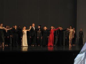 The dance was all very big and sweeping, hints of Martha Graham but never feeling like poached choreography. A myth offered up in German operatic song and modern dance with balletic sensability. In the final scene Orpheus loses Eurydice out of their deep love for each other and Orpheus’ despair leads to his own death. Stephane played his death so fully, so intensely, so painfully that there were several people in the audience not only in tears but the sobbing was audible. It was perhaps one of the most intense and beautiful death scenes I have ever scene. Pina Bausch’s Orpheus & Eurydice is gorgeous, painful, beautiful agony. I was exhausted. I was still in a daze in the lobby of the Koch Theater when Alessandra Ferri walked right up to a person standing next to me, she literally stood less than two feet from me. Then she turned and looked at me still smiling, I dropped dead, and she walked away by herself, probably not in slow motion but I swear to you it sure seemed like it!